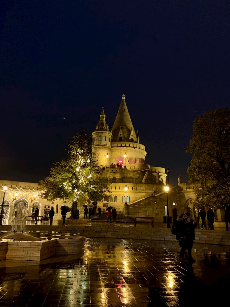 Turrets, towers, walkways and stone windows overlook the river and the Parliament building, all lit up in the dark of the evening and illuminated coldly but prettily by the shine of pouring rain.