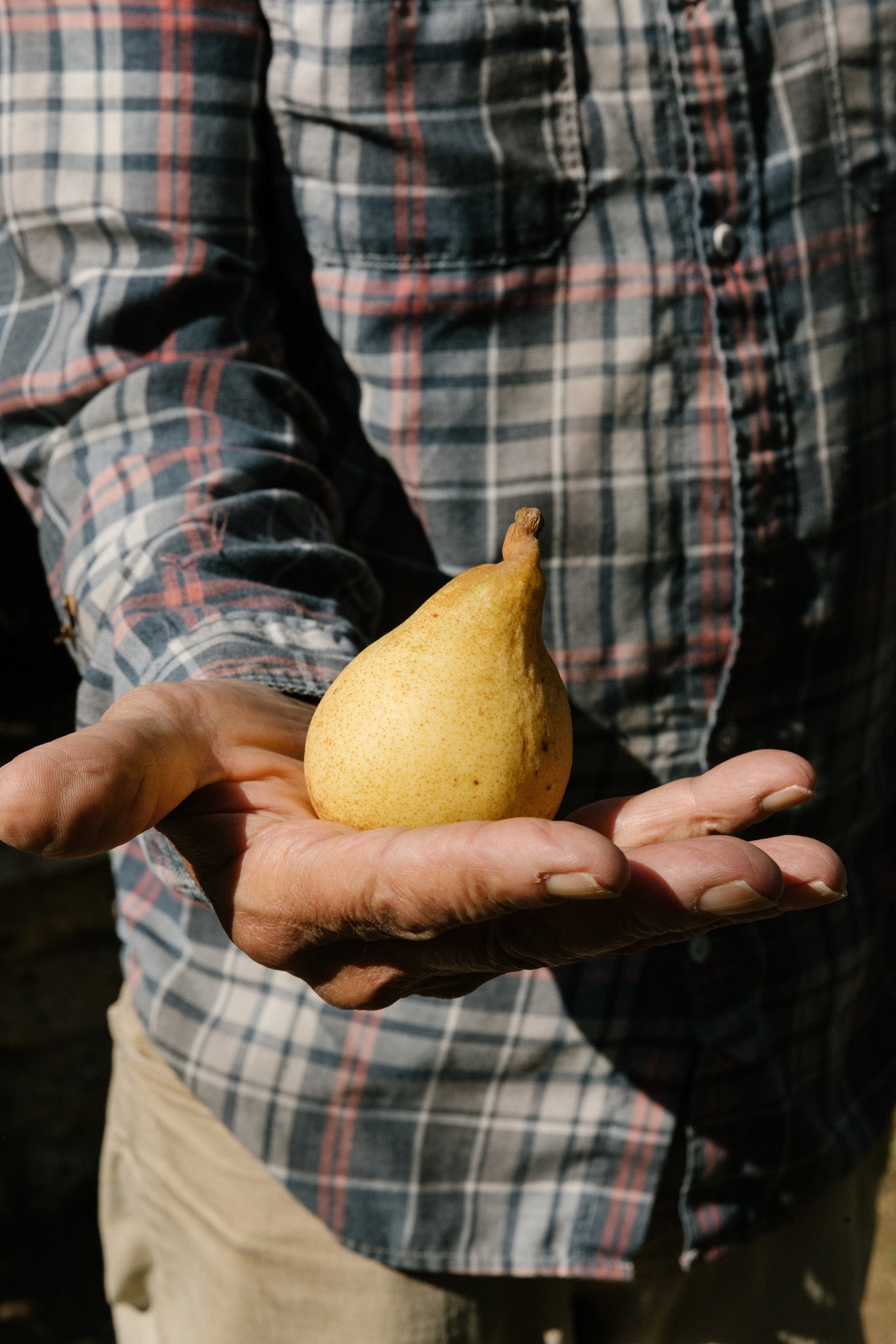 Jim Growden with a pear he picked in a community garden along the trail. Among the community gardens along the trail is one known as the agriculture lot.
