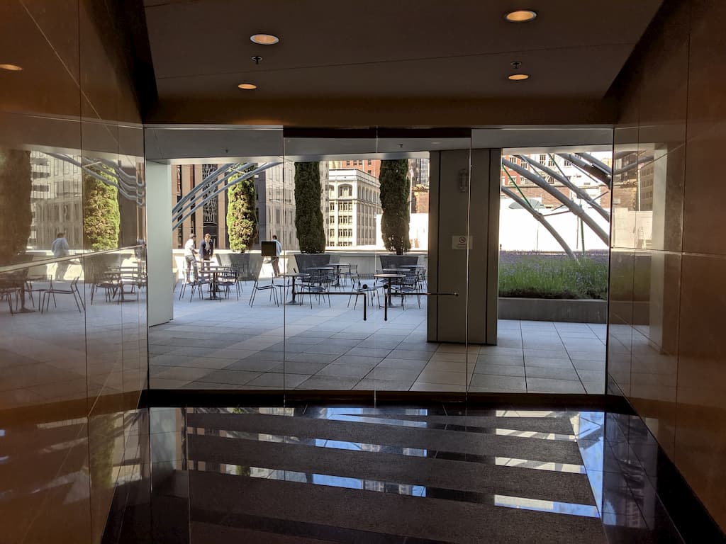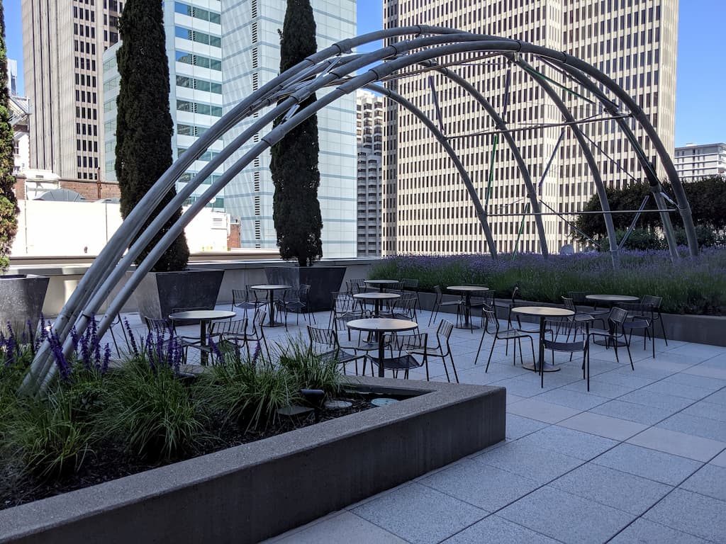 The sun terrace is a beautiful, quiet, and sheltered setting with a garden and large sculpture, furnished with several well made and clean tables and chairs. This is a really nice spot to get away from the San Francisco traffic, do some work, eat a lunch you bring with you, or just relax and look at the skyline, including a peekaboo view of the Salesforce Tower.