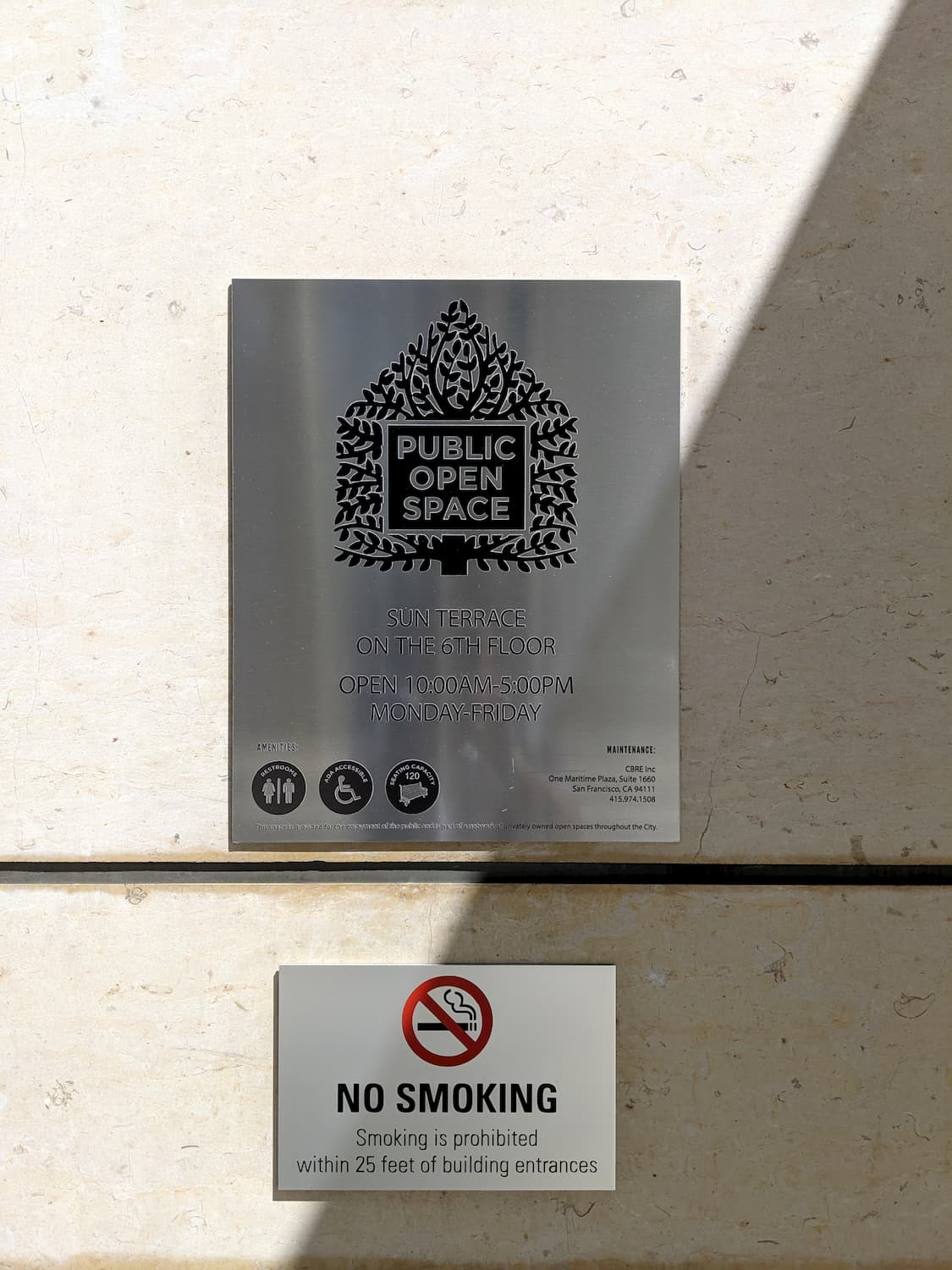 You'll find a plaque on the building near California and Front Streets indicating that the building holds a public open space, a sun terrace on the 6th floor. When you walk into the building, you'll see a similar sign behind the lobby desk, pointing to the elevators.