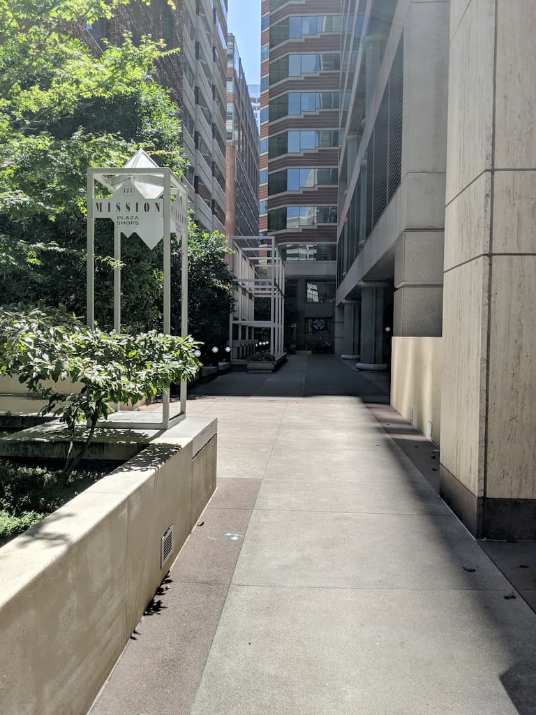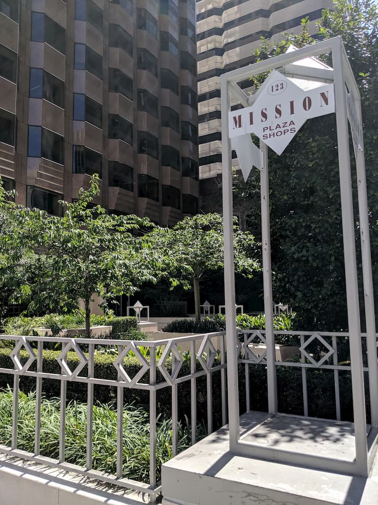 It's easy to find this open space as it shines through a street facing iron wrought fence. A sign displaying "123 Mission Plaza Shops" will greet you.