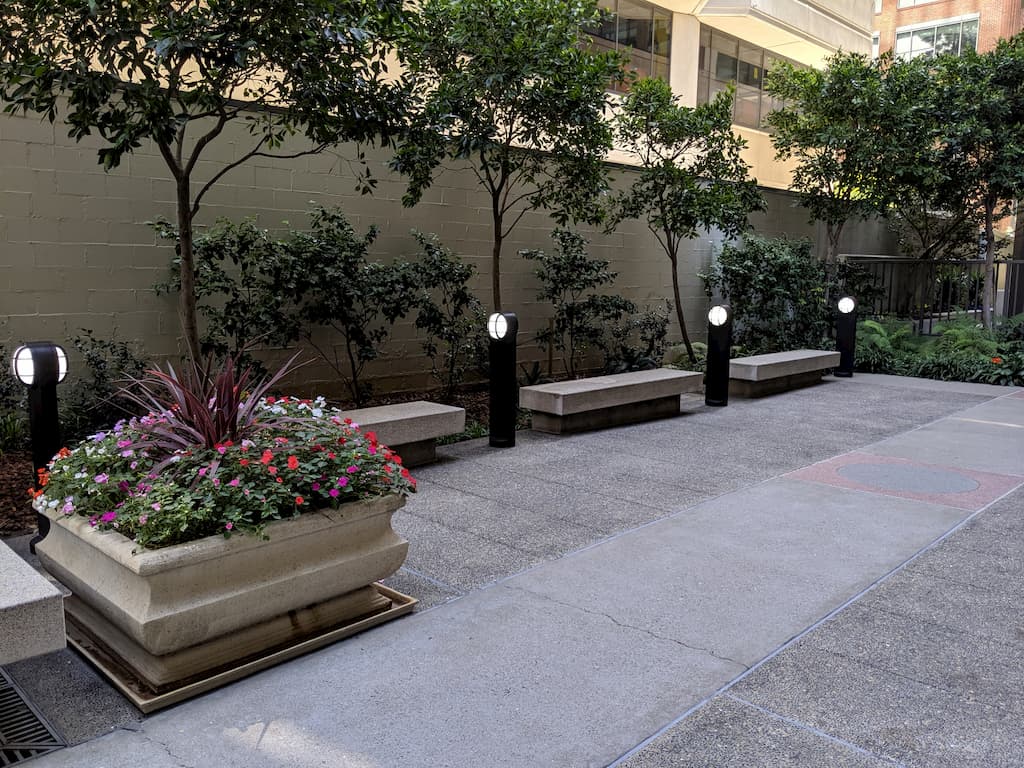As striking as the plaza is from the street, you can walk further back to find benches in the shade with cool lighting fixtures and a rectangular fountain, extending this beautiful public open space.