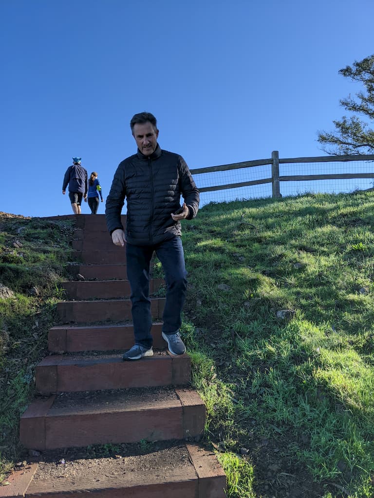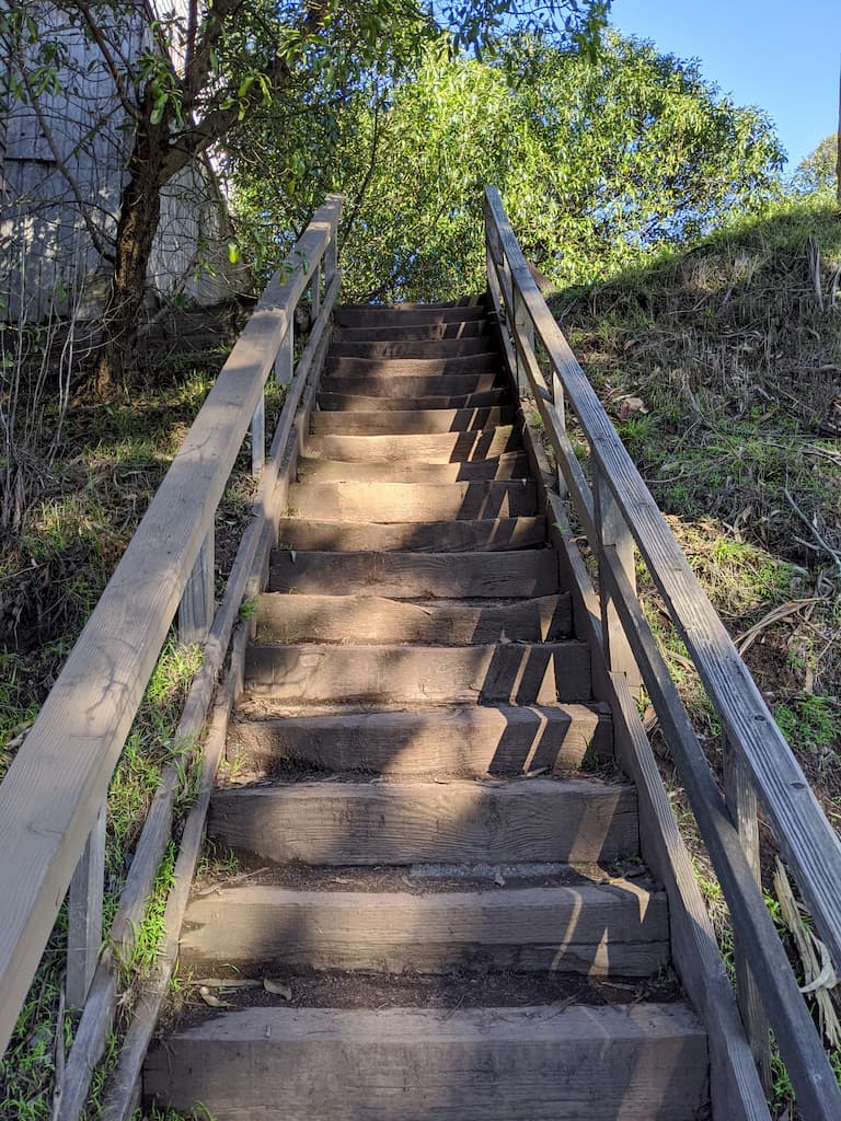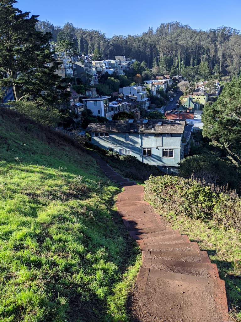 We'd driven into the city on a sunny post-Christmas Saturday morning so Dave could water his vacationing daughter's house plants, and we decided to explore the geographical center of San Francisco by starting near the base of Sutro Tower and walking down Clarendon toward Twin Peaks Drive. To the left, we spied wood steps, and as steps are meant to be climbed, we climbed them.